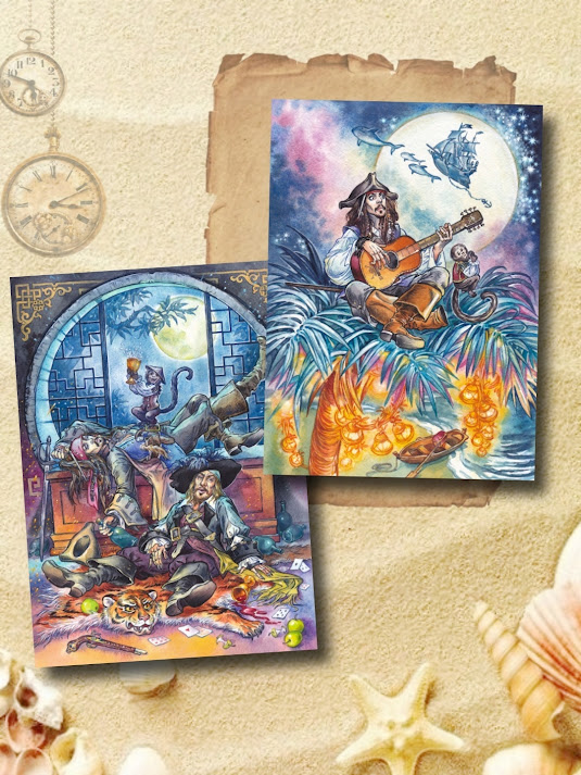 И еще один набор открыток с моими иллюстрациями по мотивам «Пиратов Карибского моря» от Магазина почтовых открыток Странник (иллюстрации не повторяются).